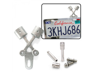 Piston style kit includes cast alloy cross piston license plate topper and 2 piston license plate bolts.